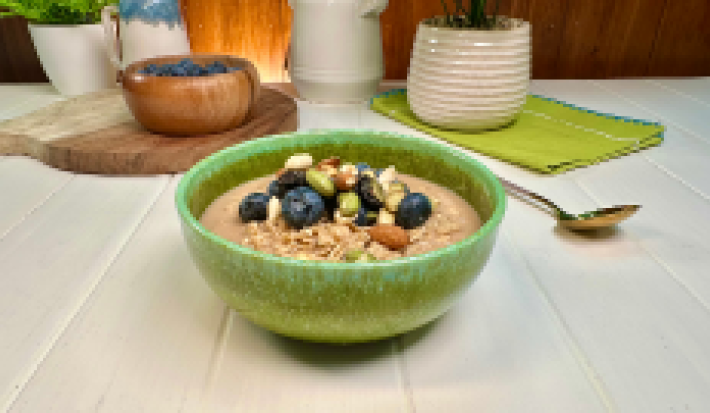 Prepara un delicioso AVENA HONEY CHAI BOWL con TEA LATTE CHAI, AVENA GLUTEN FREE, MIEL y BLUEBERRIES. Desayuno equilibrado, nutritivo y fácil de hacer.