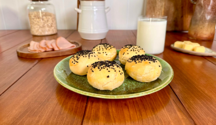 - 5.Cierra y forma los bollitos, barniza con el huevo batido y espolvorea la Leche en polvo NIDO® Familia y ajonjolí negro.