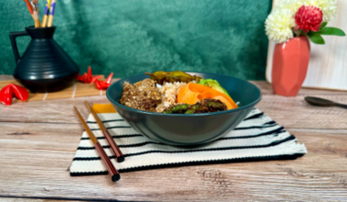 Prepara un delicioso BOWL TERIYAKI con RES, ARROZ, AGUACATE y EDAMAMES, sazonado con Sazonador CRUJIENTE MAGGI® TERIYAKI. Ideal para una comida balanceada y nutritiva.