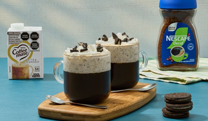 Consiente tu día con COOKIES & CREAM COFFEE hecho con NESCAFÉ® DECAF® y COFFEE MATE®. Café cremoso con galletas de chocolate y topping de crema batida.