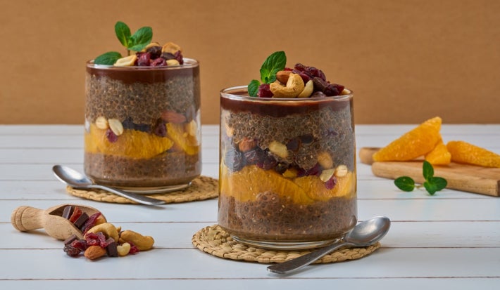 - 3.En un tazón, coloca una capa de chía pudding, luego acomoda los gajos de naranja y añade las frutas y chocolate.