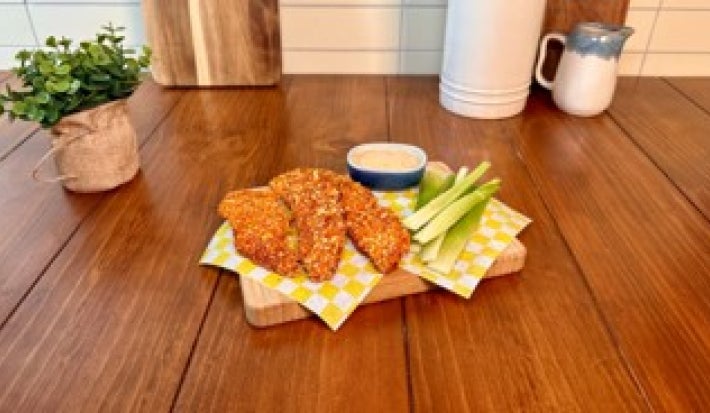 - 3.Coloca las tiras de pollo en la canastilla de la freidora de aire, sin que se encimen y cocina a 180 °C por 14 minutos.