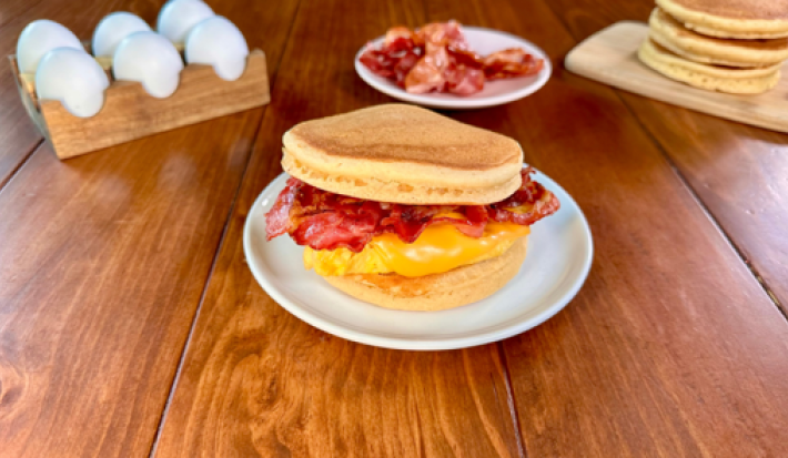 Hot cakes sándwich consiste en hot cakes rellenos con huevo revuelto, queso y tocino, decorados con leche condensada. La preparación combina una mezcla para hot cakes con leche evaporada y vainilla, huevos sazonados y tocino frito para ensamblar sándwiches de tres piezas.