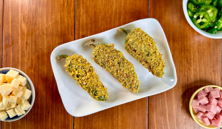 Prueba JALAPEÑO CRUNCHY relleno de queso manchego y jamón, empanizado con MAGGI CRUNCHY PIMIENTA LIMÓN. Botana CRUJIENTE PICANTE irresistible para compartir.