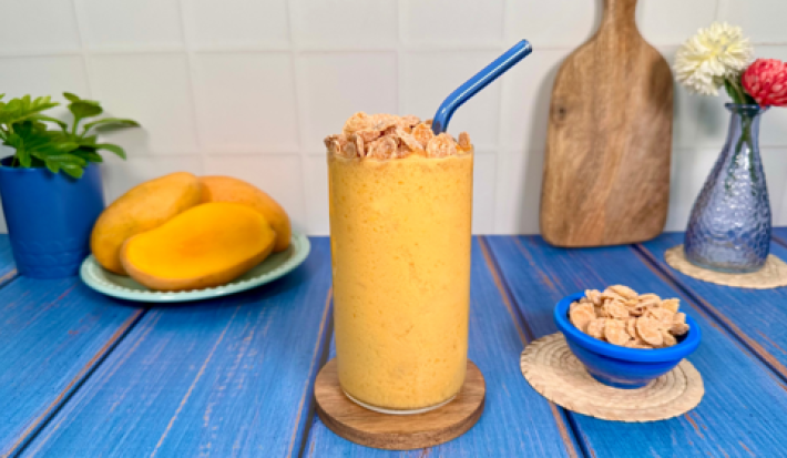 Disfruta un MANGO CRUNCH SMOOTHIE cremoso y refrescante con mango natural, leche y cereal crujiente; receta fácil y deliciosa para un desayuno o snack energético.