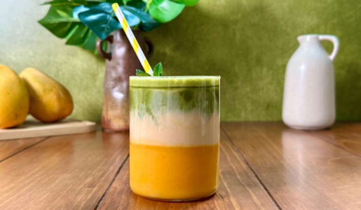 Refrescante MANGO MATCHA LATTE FRÍO con BEBIDA VEGETAL DE AVENA y MATCHA ORGÁNICO. Bebida cremosa, saludable y fácil, ideal para días calurosos con toque tropical.