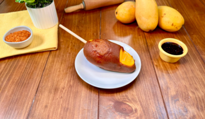 - 1.Inserta cada mango en un palito de madera, cubre los mangos con la pasta de chamoy y reserva.