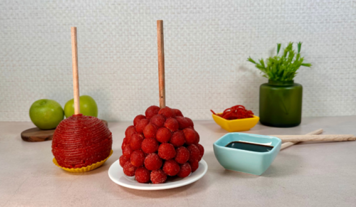 - 3.Cubre una manzana con las gomitas sabor fresa y la otra con los dulces enchilados en tiras; añade un poco de chamoy en polvo a cada una.