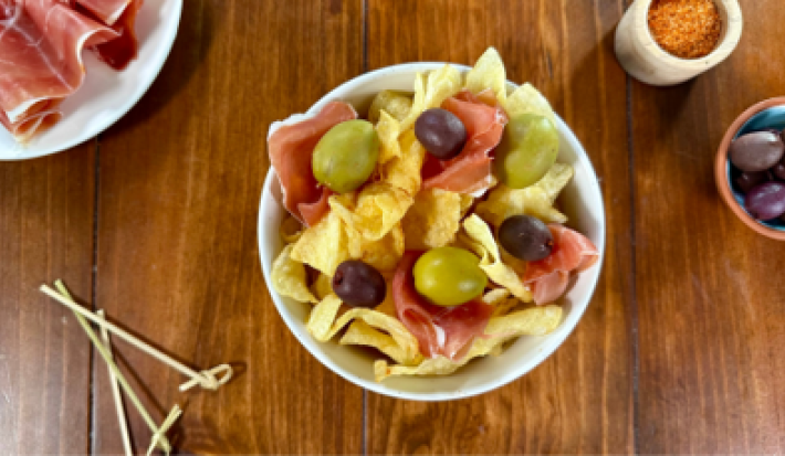 Disfruta unas PAPAS HEDIONDAS, botana irresistible con papas fritas, aceitunas, jamón serrano y salsas picantes. Receta fácil y perfecta para reuniones.