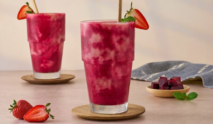 - 3.En un vaso sirve el smoothie de betabel intercalando con el de fresa.