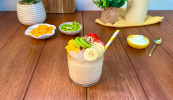 - 3.Distribuye encima de los vasos el plátano, mango, kiwi, fresas y granola, espolvorea con Leche NIDO® Familia y disfruta.